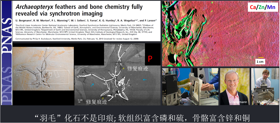 2009年,美国斯坦福同步辐射光源(SSRF)的实验室科学家尤.伯格曼(Uwe Bergmann)与英国曼彻斯特大学的地球化学教授罗伊·沃格里乌斯(Roy A Wogelius)合作,利用SSRF的同步辐射快速扫描X射线荧光技术(SRS-XRF),对发现自德国索伦霍芬的始祖鸟化石进行初步研究,获得了微米分辨率的元素分布图,从而开启了利用同步辐射光源,对珍贵的鸟类和恐龙等化石标本开展无损和原位研究的序幕。