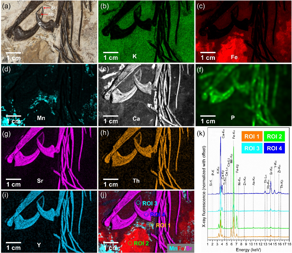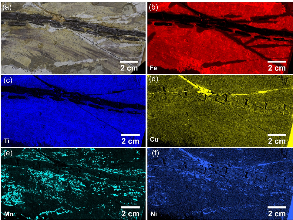 图1. 首张大面积微米分辨率恐龙化石X射线荧光元素分布图(艺术图)