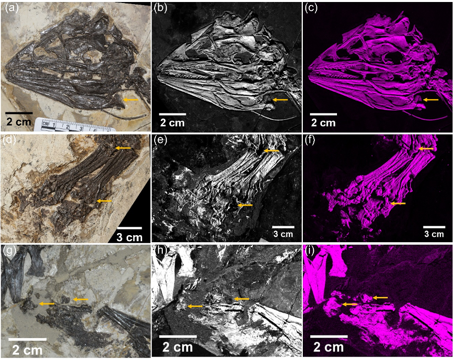 图6. 嘉年华龙头骨、后腿和腰带部位的Ca和Sr元素分布图。箭头指示部位为骨骼损伤造成Ca元素的流失。