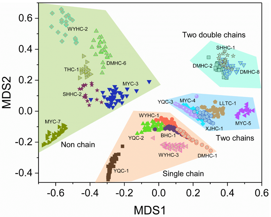 为了进一步研究趋磁球菌种类和磁小体形貌之间的关系,该研究团队基于磁小体链结构、数目、宽度和宽长比数据,进行了非度量多维尺度分析(nonmetric multidimensional scaling, nMDS)。结果显示,代表同种趋磁球菌的磁小体形态学数据的点聚在一起,代表不同种趋磁细菌磁小体数据的点彼此远离。这说明趋磁球菌的生物学种类和磁小体形貌结构特征是一一对应的,即矿化产生的磁小体具有一定程度的菌种或菌株特异性。